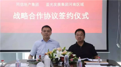 2019年8月8日,同信地產(chǎn)董事長麻延衛(wèi)與藍光發(fā)展河南區(qū)域總裁康凱正式簽署戰(zhàn)略合作協(xié)議,同信集團戰(zhàn)略投資中心總經(jīng)理馮利巍與藍光發(fā)展河南區(qū)域助理總裁朱金金等領(lǐng)導共同見證了這場河南區(qū)域的地產(chǎn)盛事。